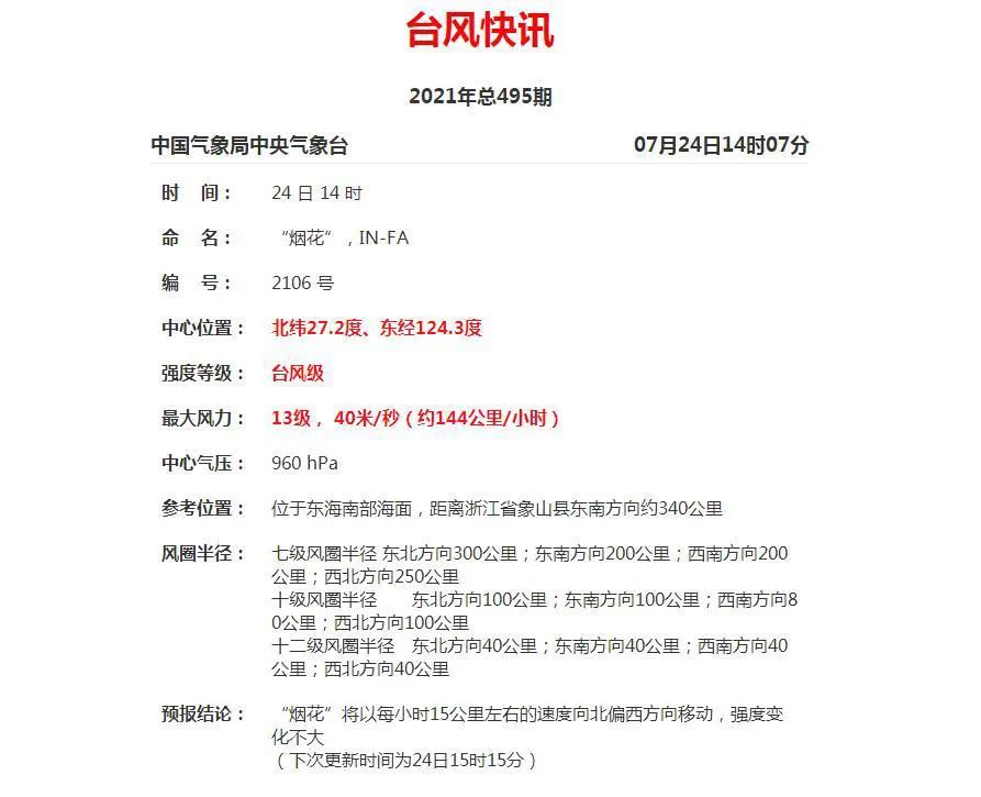 中国天气网讯 中央气象台于24日06时发布了台风橙色预警,今年第6台风“烟花”(台风级)的中心24日9时位于距离浙江省象山县东南方向约435公里的海面上,将以每小时15公里左右的速度向北偏西方向移动,逐渐向浙江中北部一带沿海靠近,并将于25日下午到夜间在浙江舟山到玉环一带沿海登陆(台风级或强台风级,12-14级,33-42米/秒)。登陆后有可能在华东地区回旋。经综合研判和应急会商,中国气象局提升重大气象灾害(台风)Ⅲ级应急响应为Ⅱ级
