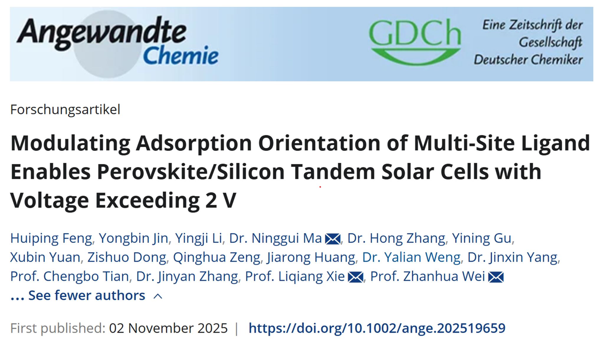2025年11月2日,我院马宁贵讲师、谢立强教授、魏展画教授团队在国际顶刊Angewandte Chemie上发表了题为“Modulating Adsorption Orientation of Multi-Site Ligand Enables Perovskite/Silicon Tandem Solar Cells with Voltage Exceeding 2 V”的文章。