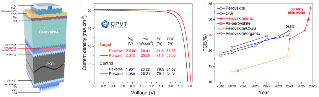 针对柔性叠层电池效率长期难以突破30%的瓶颈,研究团队首次开发了反应离子沉积(RPD)制备的铈-氢共掺杂氧化铟(ICO:H)复合层。该复合层具备超高载流子迁移率与低沉积损伤,相较于传统掺锡氧化铟(ITO),展现出更优的载流子复合性能、更强的自组装单分子膜吸附能力、更多的锚定位点以及更佳的钙钛矿晶体生长诱导能力。同时,团队在掺锌氧化铟(IZO)前端透明电极沉积过程中引入原位低温退火工艺,显著提升了电极的导电性、透光性、机械强度与结晶度,并有效抑制了卤素离子迁移,从而增强了器件的整体稳定性。基于上述透明导电氧化物复合层与电极的性能优化,研究团队制备的柔性钙钛矿/晶硅叠层电池实现了33.6%的认证效率,开路电压创下2.015V的新纪录,进一步缩小了柔性器件与刚性器件在转换效率方面的差距。