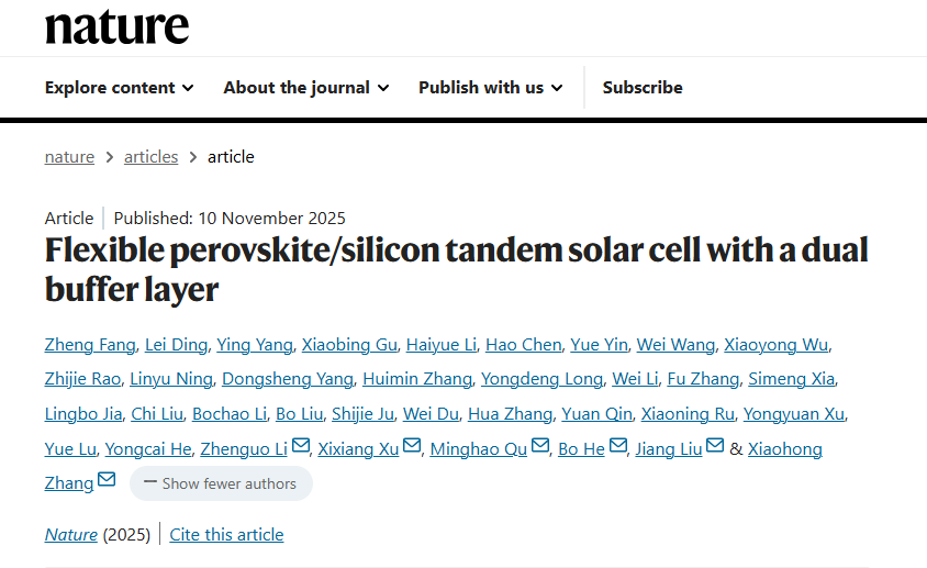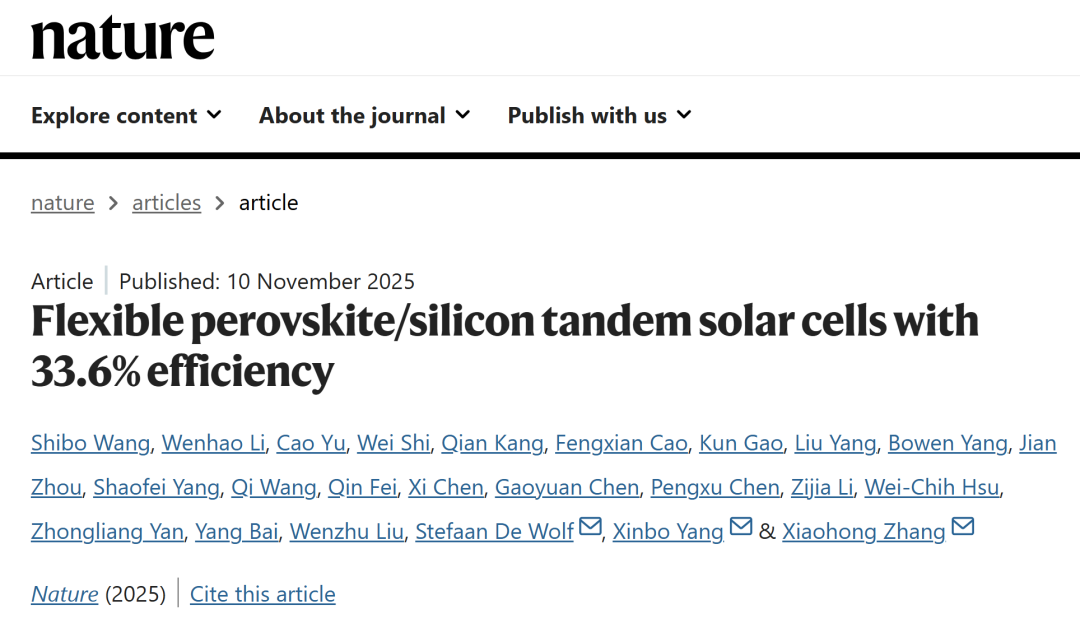 该研究所研发的柔性钙钛矿/晶硅叠层太阳能电池,经美国可再生能源实验室认证,其转换效率高达33.4%,大面积晶圆级叠层组件效率亦达到29.8%,创造了该类型器件的世界最高效率纪录。同时电池在经历43,000次极端弯折和-40℃至85℃剧烈温差循环老化测试后,仍能保持97%以上的初始效率。此项突破性成果的核心在于成功攻克了柔性太阳能电池效率与稳定性难以兼顾的行业难题。研究团队创新性地通过调控原子层沉积工艺,构建出“刚柔并济”的双层缓冲层结构。该设计在分子尺度上有效协调了应力缓冲与高效传输的矛盾。