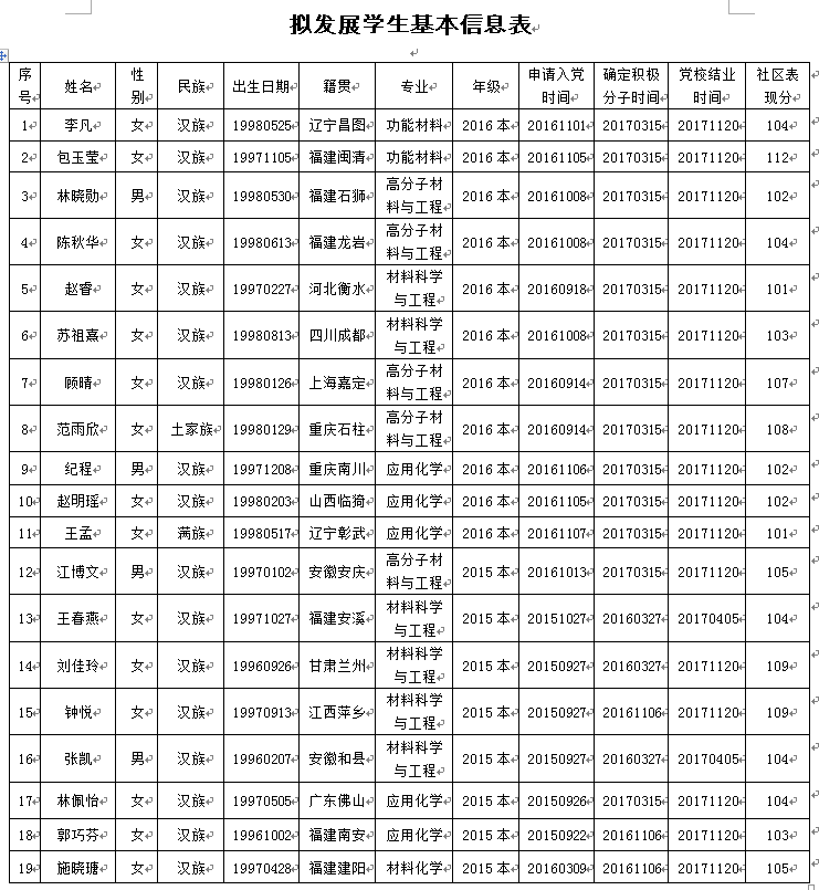经党组织培养考察,近期拟发展李凡等19位同学为中共预备党员。根据校党委组织部《中共永利集团yl6809委员会发展党员工作实施细则》(华大委〔2014〕5号)精神,党员和群众对拟发展李凡等19位同学为中共预备党员如有意见或建议,可采用口头或书面形式于2018年4月4日--4月11日(5个工作日)向院党委或校党委组织部反映。
