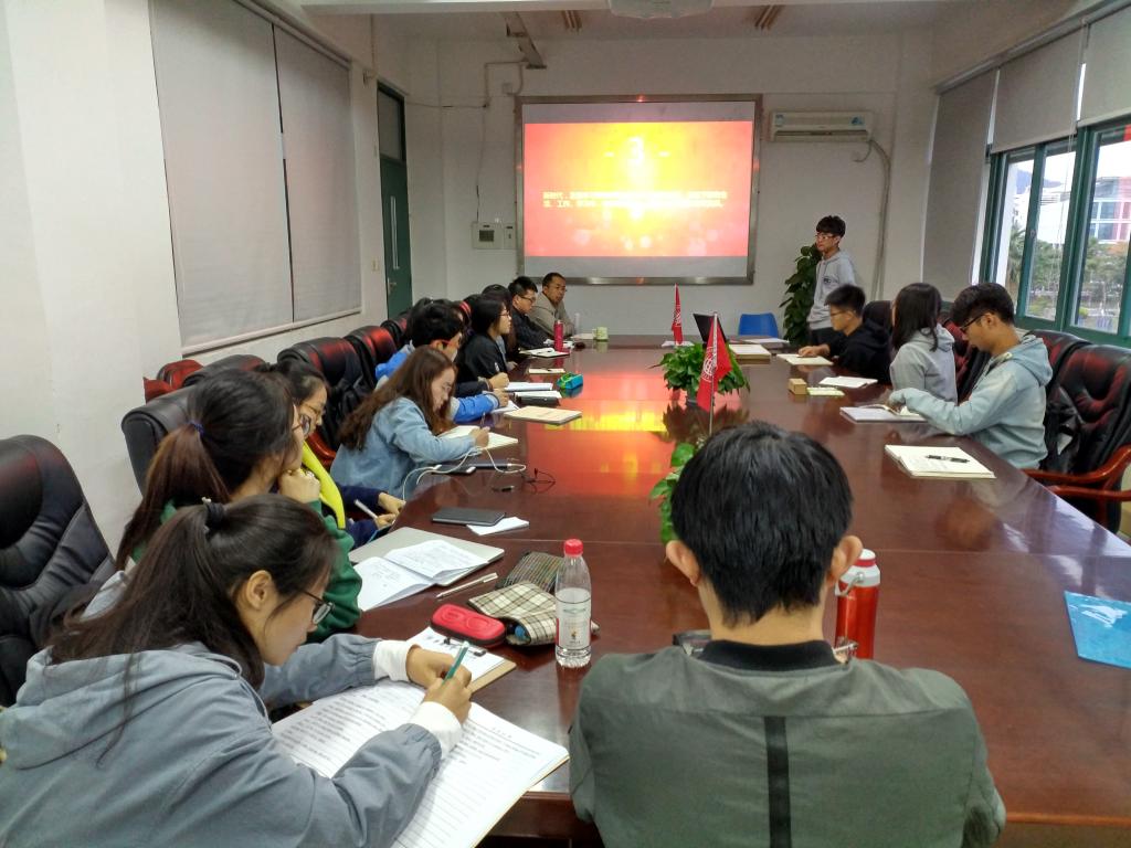 首先,支部党员赵贝通过“新时代”、“新思想”、“新征程”、“新党章”四个关键词,带领支部各位同志从“新”解读十九大精神,接着,赵贝同志通过认真比较,带领支部党员细致地学习了十九大对《中国共产党章程》的修改内容。最后,支部同志就“如何学习宣传贯彻十九大思想”进行了充分讨论,表达自己在新时代生活、工作、学习中努力成为符合新时代要求的一名合格青年党员的决心。