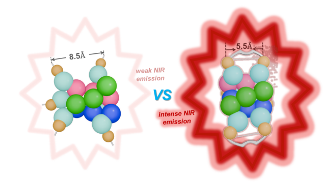 研究表明这种结构差异带来了显著的性能区别:顺-顺构象配体保护的铜簇在近红外I区呈现强发光;而单膦配体保护的铜簇的溶液相则表现较弱的发光性质。通过变温荧光光谱、超快瞬态吸收光谱与密度泛函理论计算分析,这种性能提升源于双重作用机制:一方面,刚性配体壳层通过空间位阻限制了表面原子的振动,有效抑制了非辐射衰减通道;另一方面,配体诱导的电子结构调制加速了系间窜越过程,使激发态电子快速布居到发射三重态,显著提升辐射衰减速率。