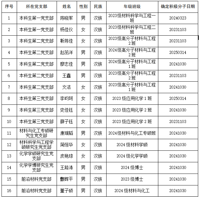 根据发展党员相关工作要求,经党组织培养考察、民主测评和征求群众意见情况,党支部拟确定陈晓军等16位同学为发展对象,现将学生基本情况进行公示,若党员和群众对其有意见或建议,可在2026年4月1日——2026年4月8日公示期间向学院党委反映。