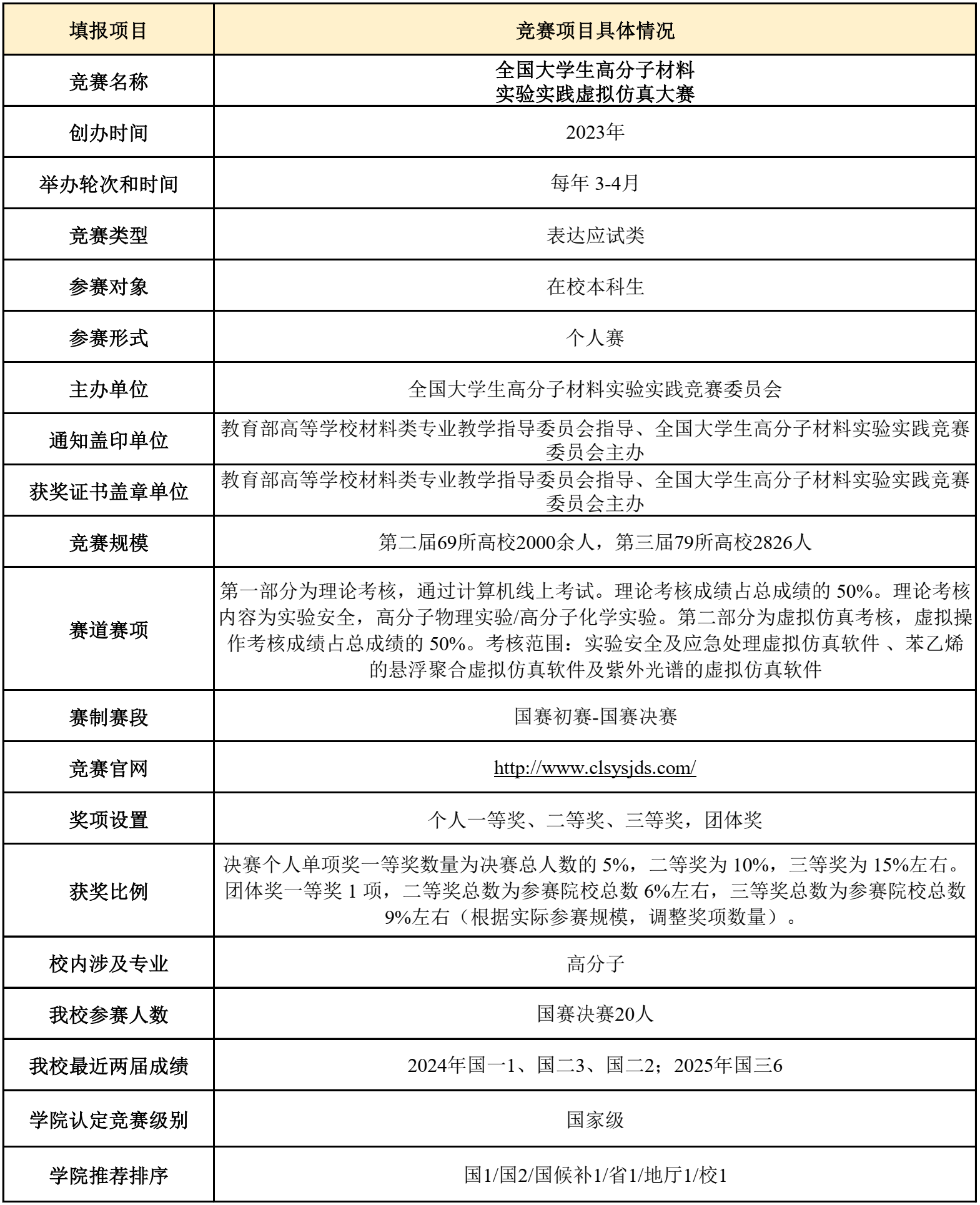全国大学生高分子材料实验实践虚拟仿真大赛(线上比赛)是在全国大学生高分子材料实验实践大赛(线下比赛)发展而来,秉承“以赛促学、以赛促教、以赛促评”的办赛宗旨,培养高分子专业学生的实践能力和创新精神,同时大赛的举办对全国高分子材料专业人才培养模式和实践教学改革有着重要的意义,本着“友谊第一、比赛第二”“交流第一、奖牌第二”的办赛方针,大赛为全国高分子专业师生提供了一个相互交流和学习的平台,对进一步规范基层实验教学,促进实验教学方法、教学内容和教学体制的改革创新起着重要作用。大赛由教育部高等学校材料类教学指导委员会指导、全国大学生高分子材料实验实践大赛竞赛委员会主办。